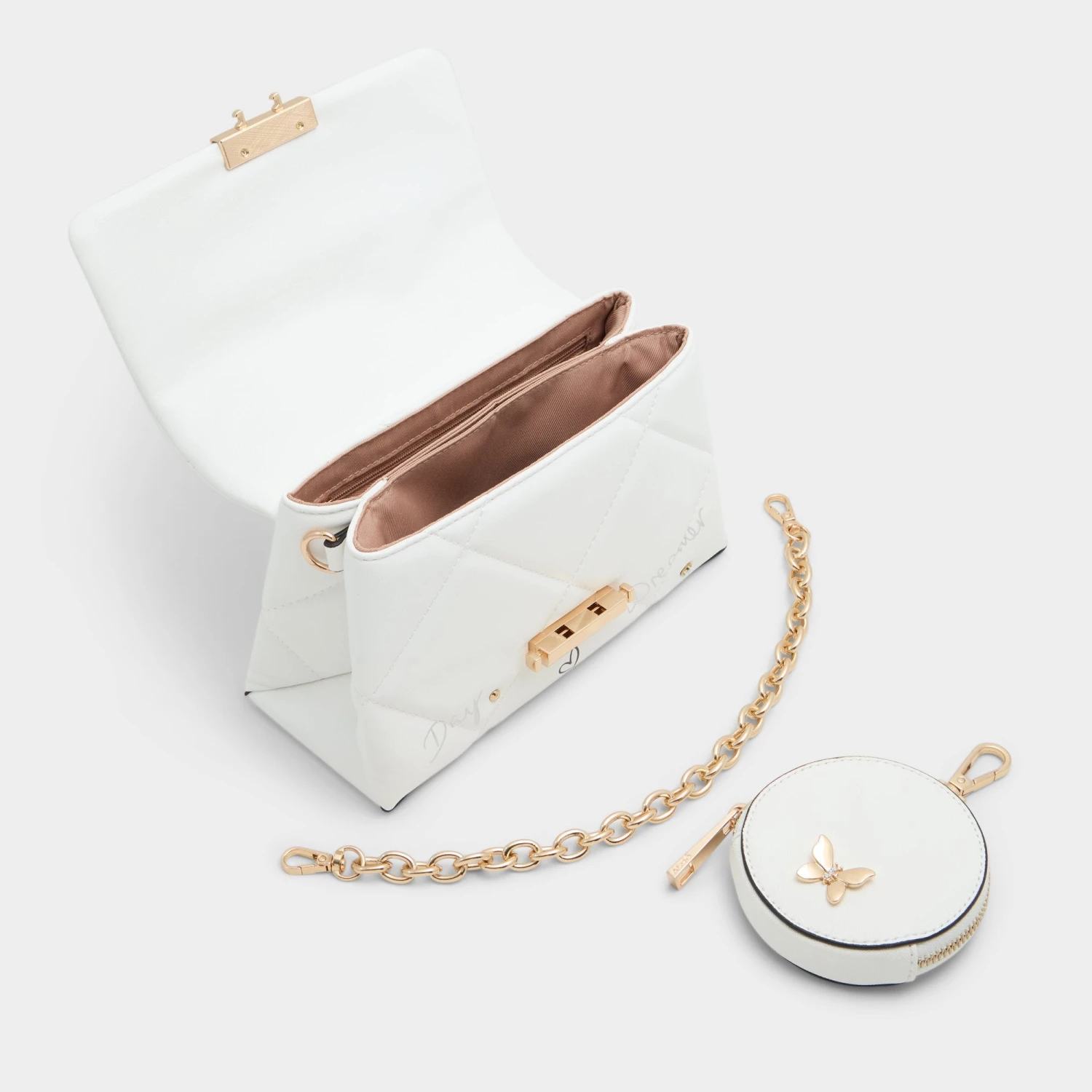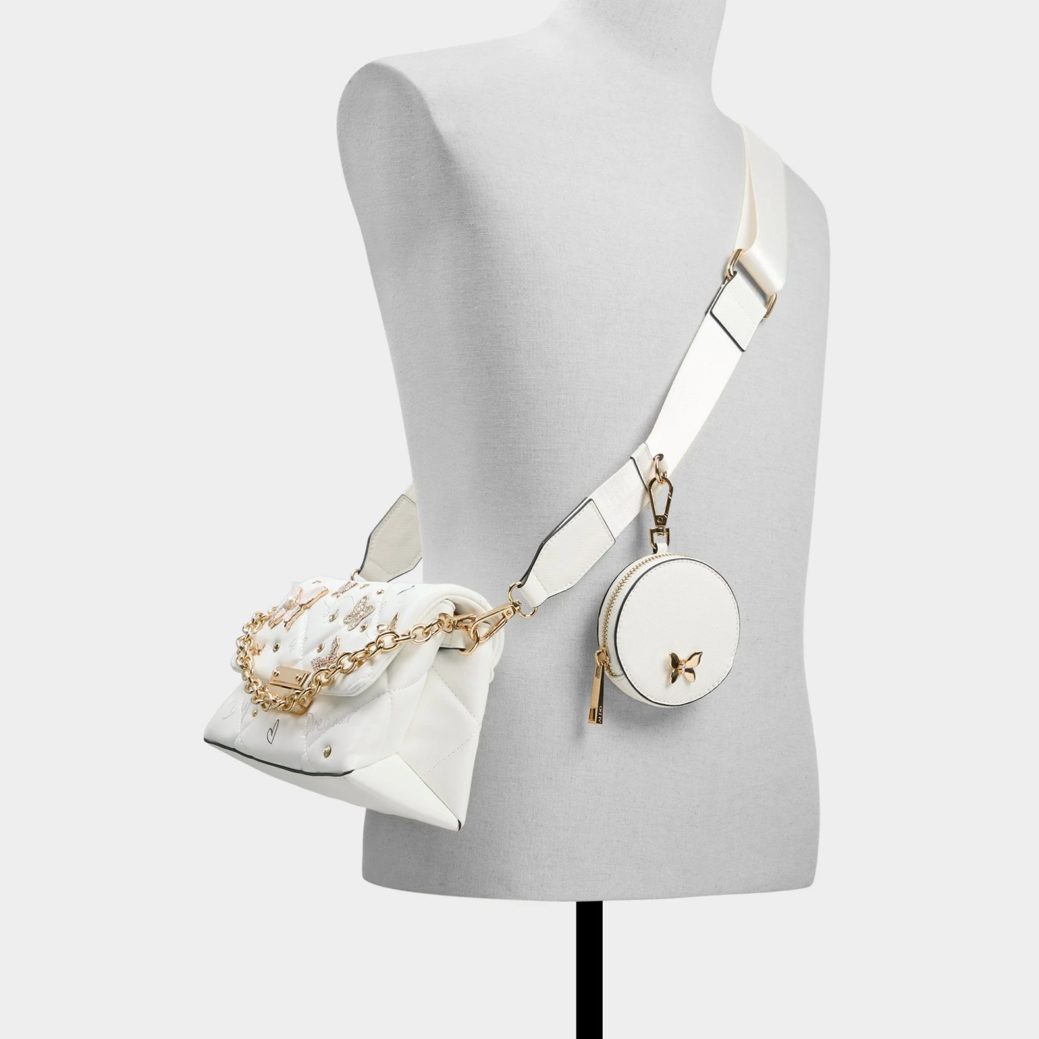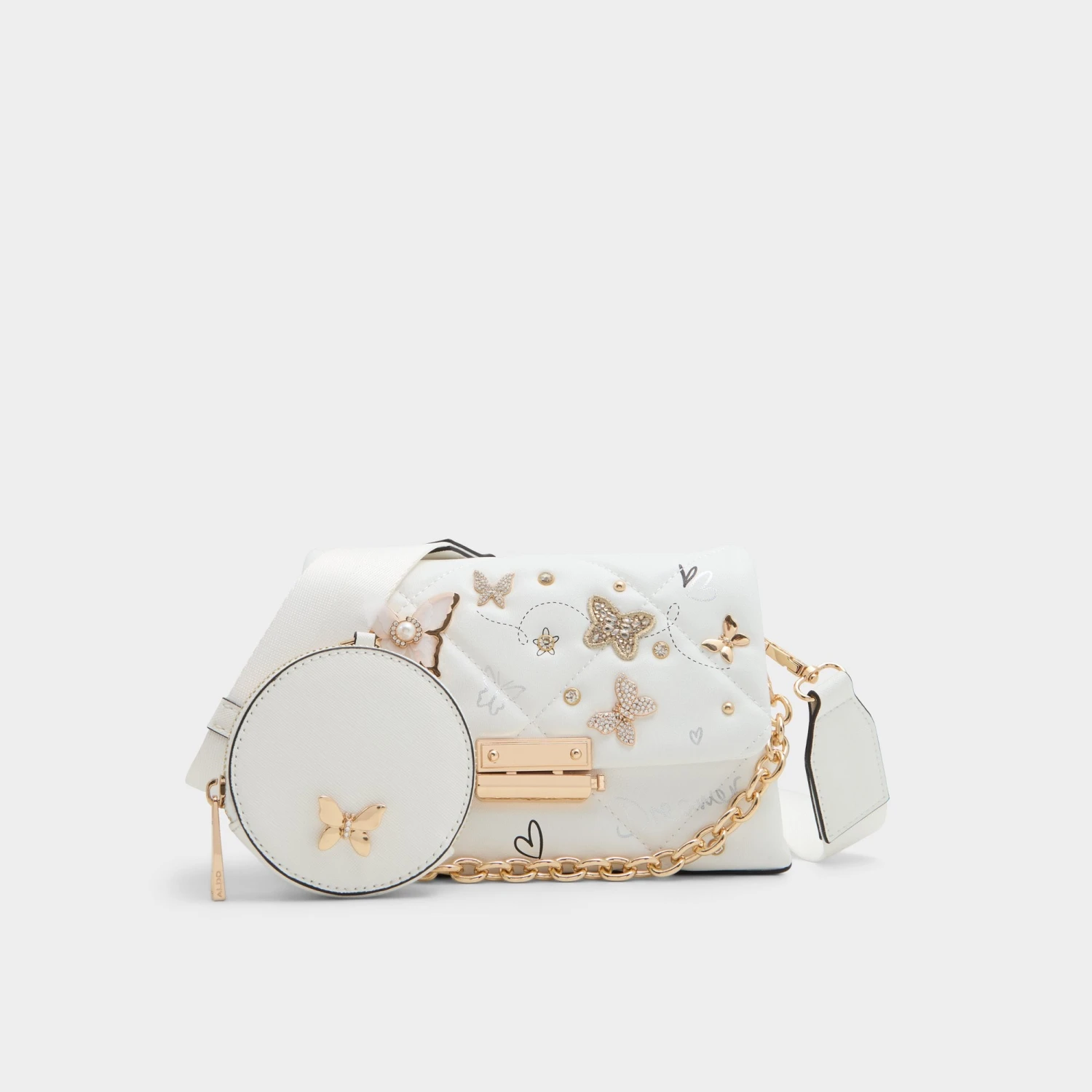 Step into a world of whimsical sophistication with the Aldo Camberlyyx quilted crossbody bag. Designed for the modern woman who appreciates a touch of dreamy detail, this stunning accessory features delicate butterfly charms that capture the light and your imagination. Whether you are heading to brunch or a night out, its versatile design ensures you carry your essentials with effortless style and organized ease.