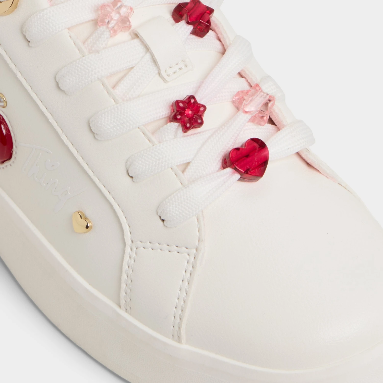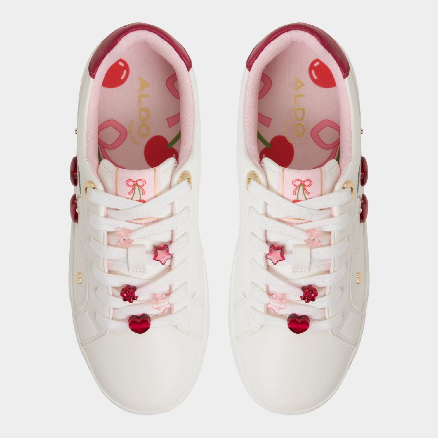 - Features: Cherry appliques, gold heart hardware, cup sole