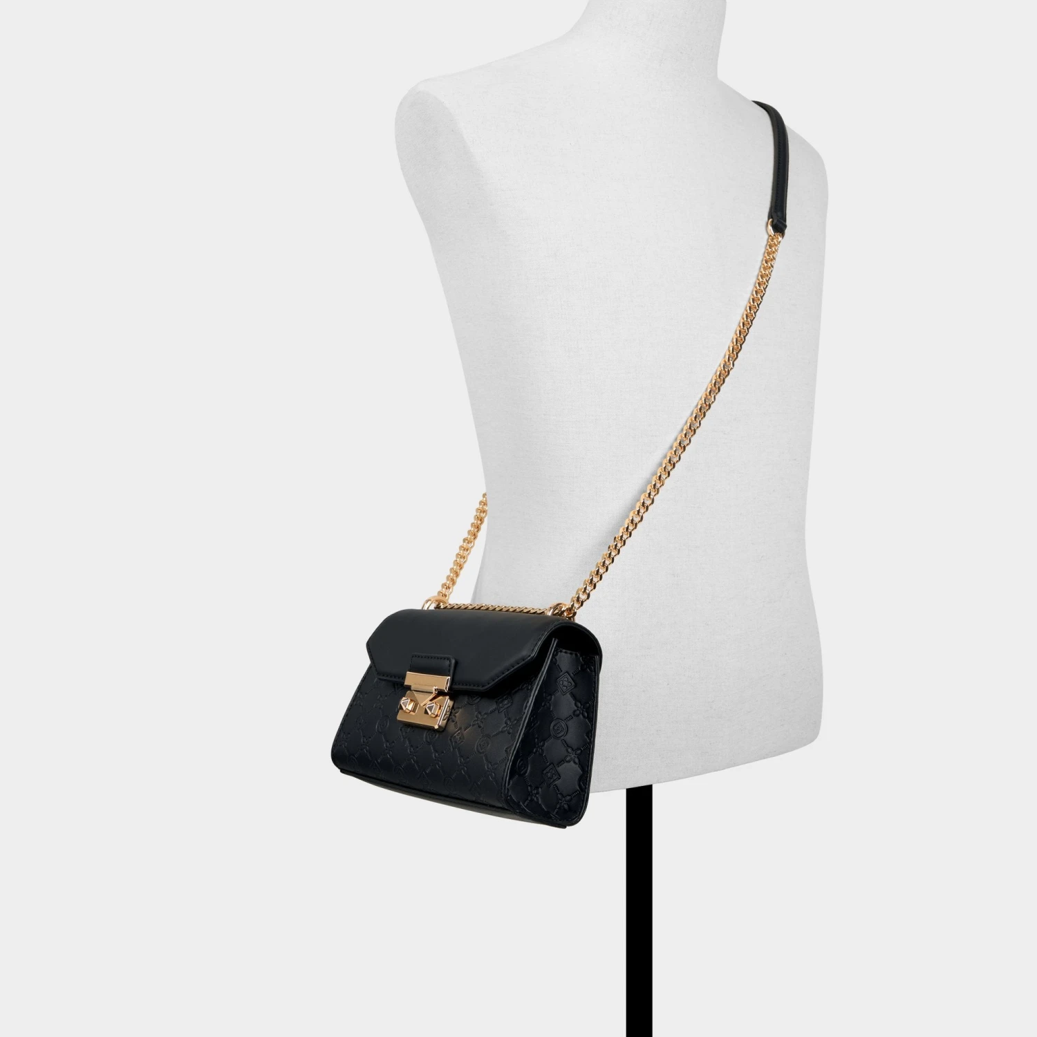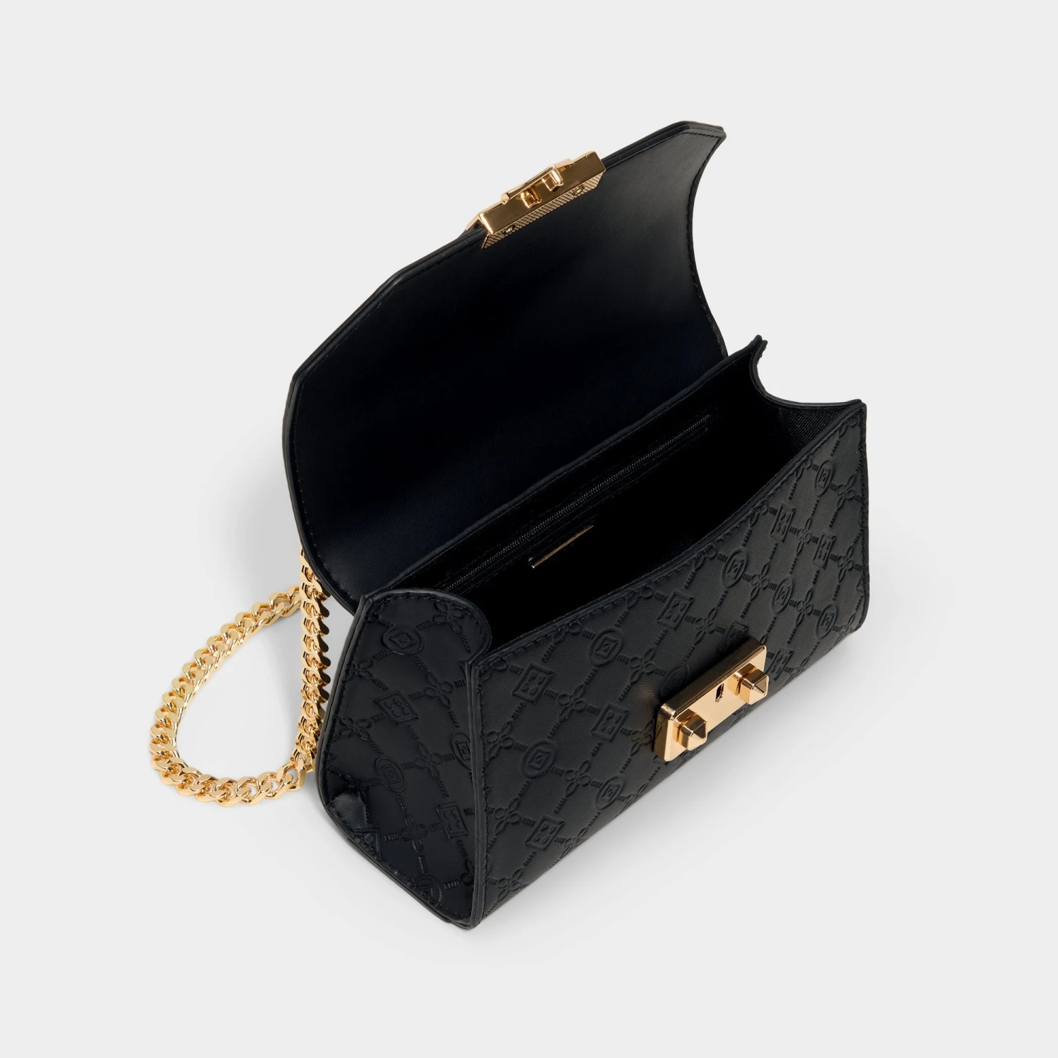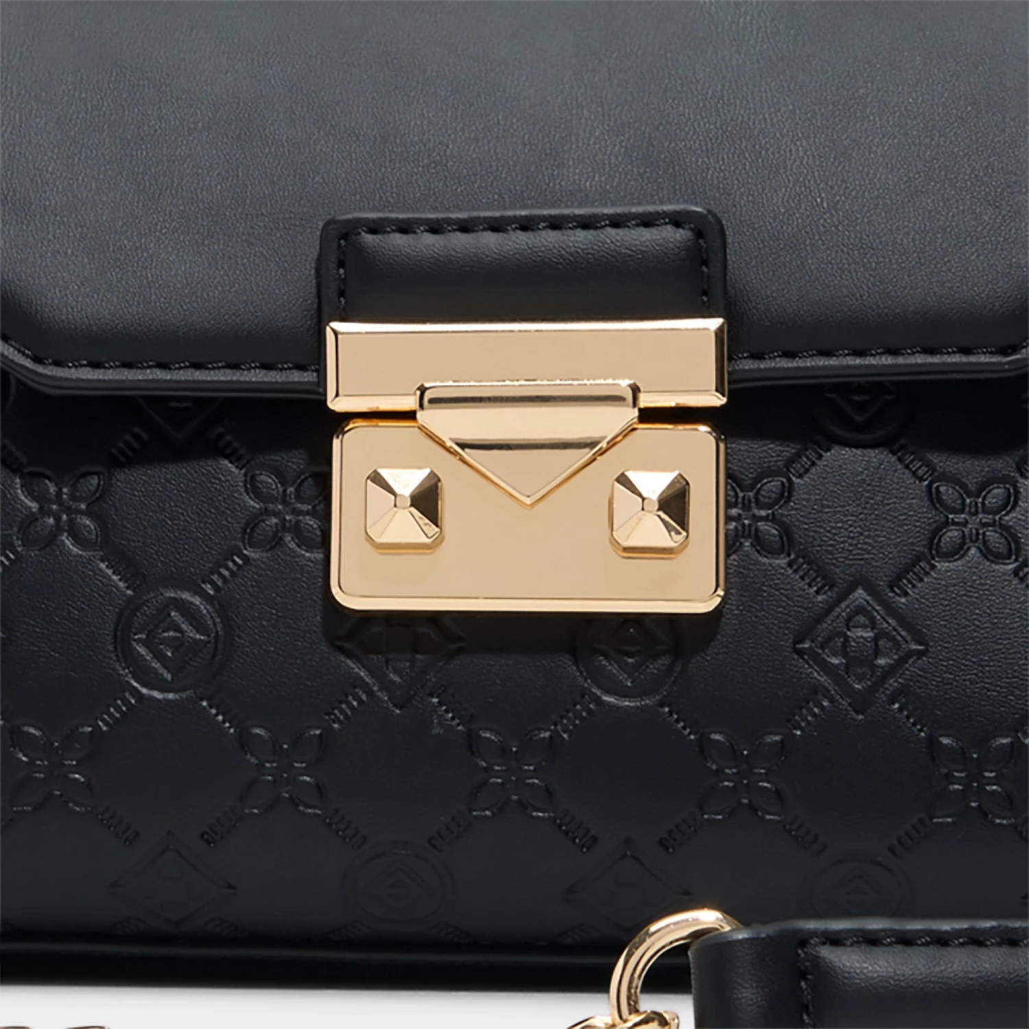 Midnight-black quilted synthetic leather frames a geometric flap crowned by a bold gold push-lock, giving this structured crossbody city-polish with a whisper of glam that travels from desk to dinner. Carry it with a satin slip for rooftop dinners, or sling it over blazer-and-jeans for city coffee runs.