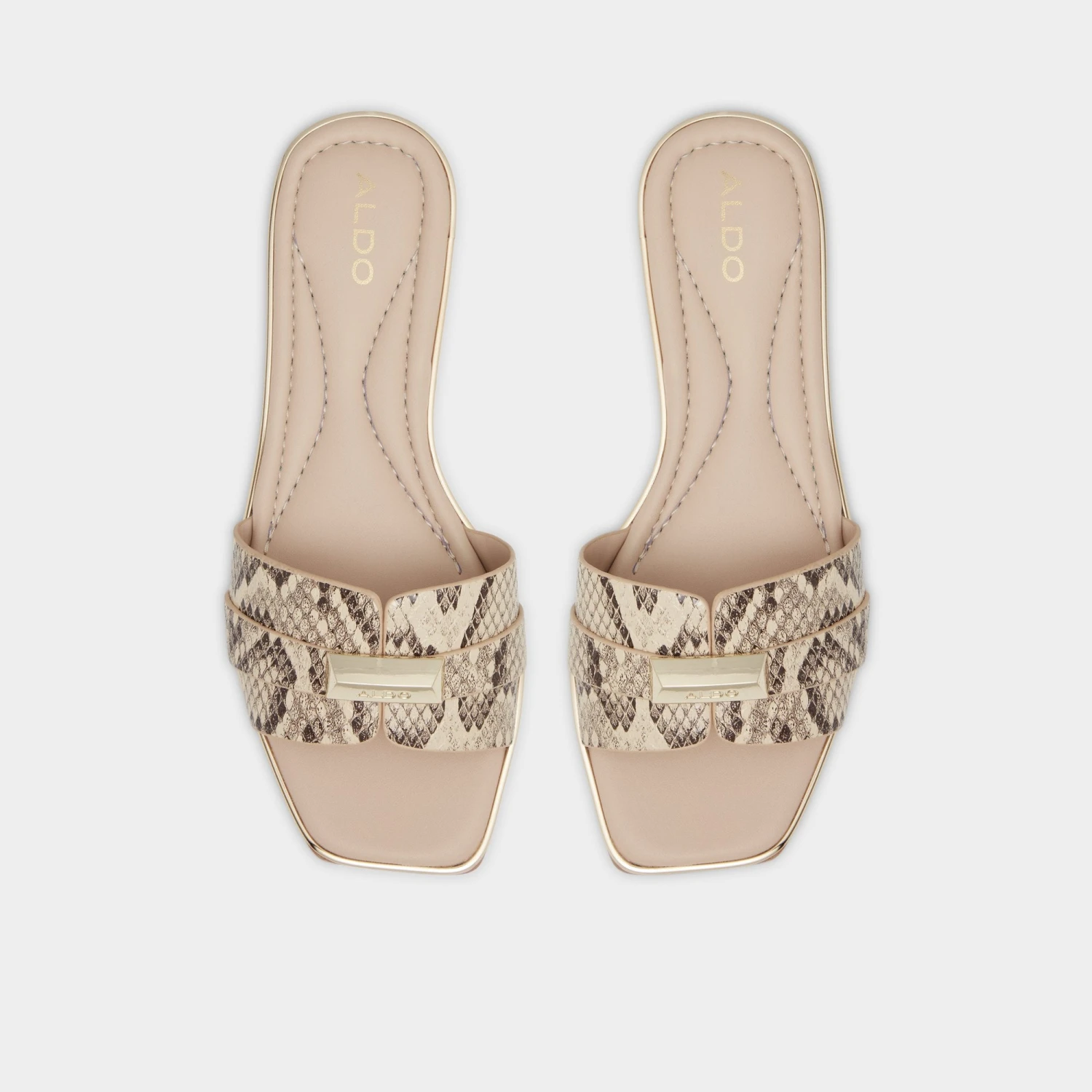 Snakeskin-patterned bands wrap the slide in untamed polish, their subtle gold gleam catching the city light, while flexible flat soles keep every step easy from sidewalk chatter to brunch lines. Pair with linen cropped pants for markets, or slip them under a satin midi when patio cocktails turn into starlit strolls.
