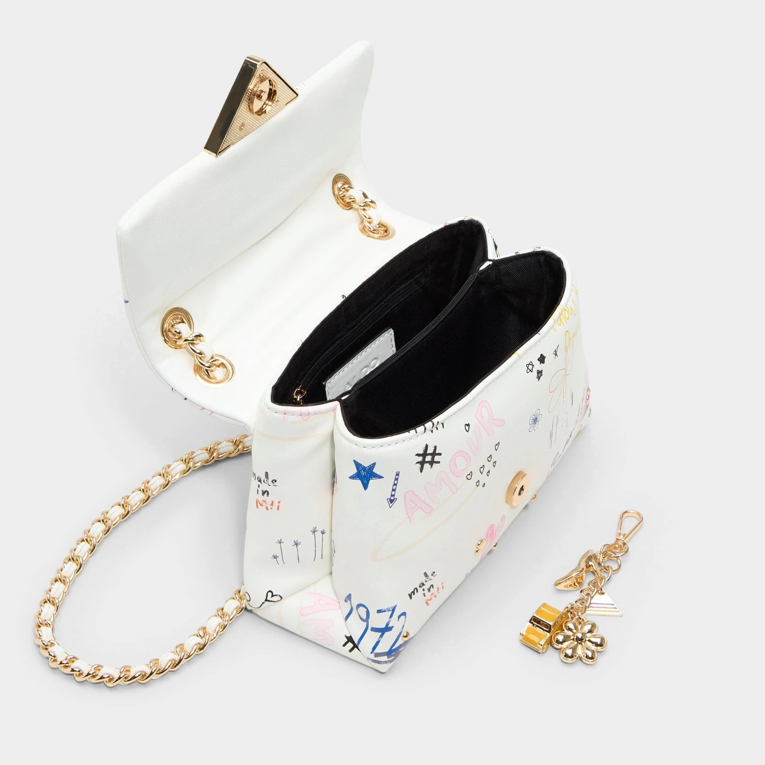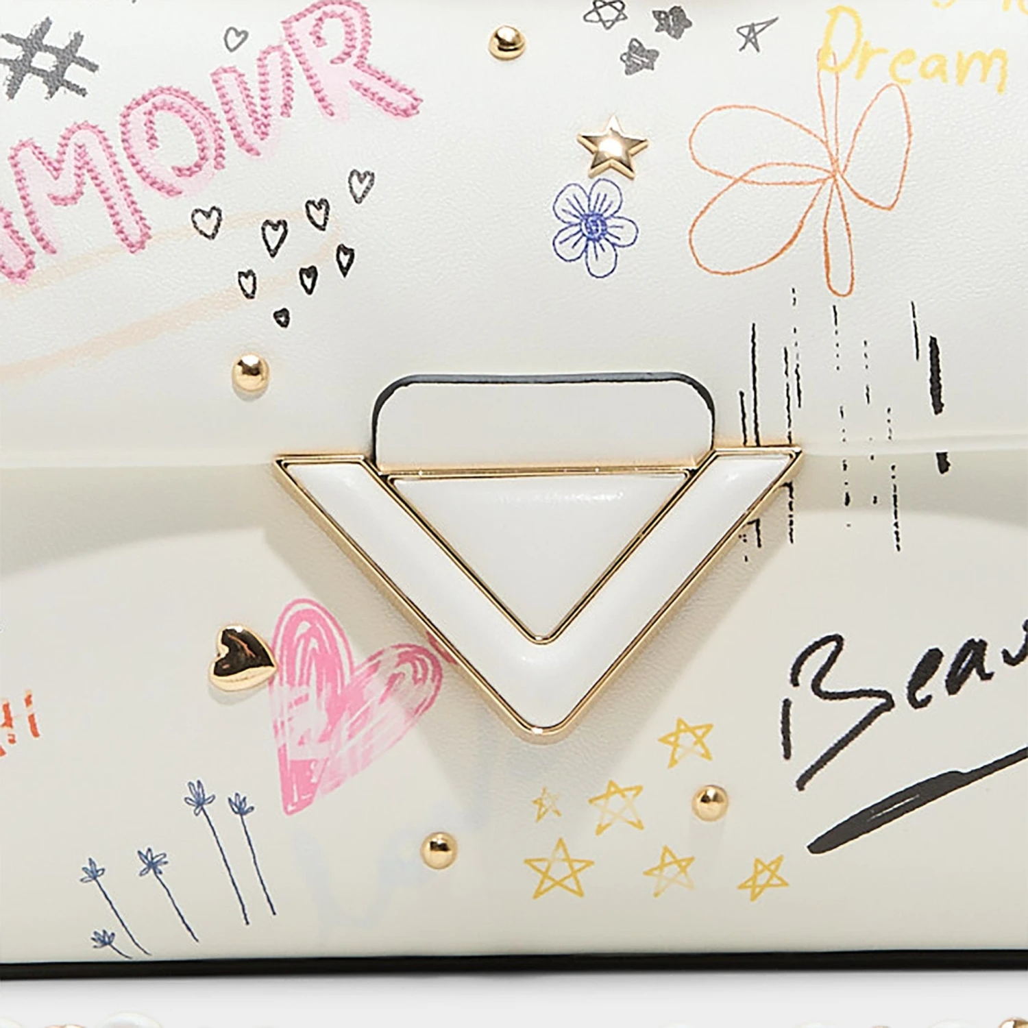 Notebook doodles go glam on buttery white leather adorned with hearts, stars, and handwritten amour, crowned by a sharp triangle clasp and a sleek gold chain that polish the art-class spirit for grown-up plans. Sling over floral minis at patio brunches or tuck against black slips at rooftop parties to set the mood.