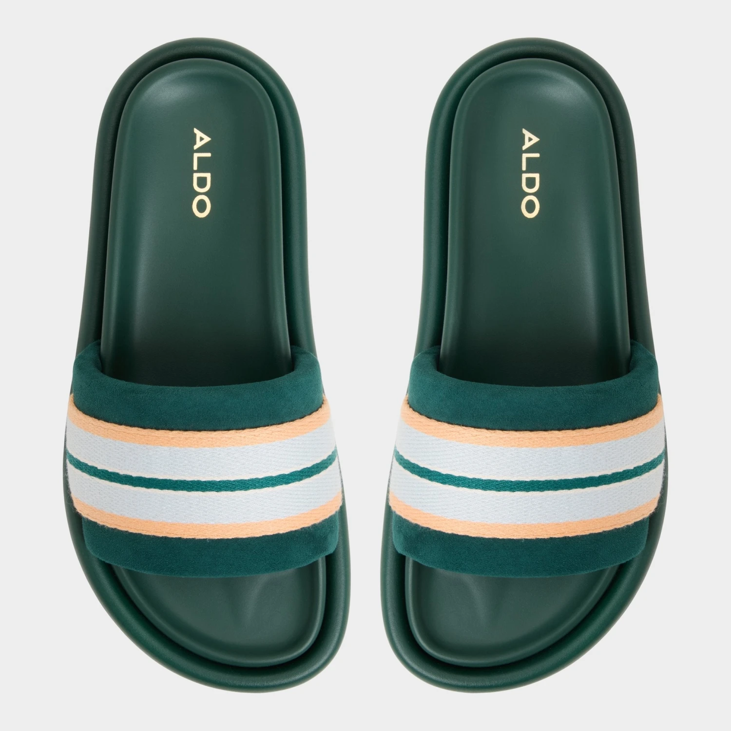 Embrace a retro-inspired aesthetic with the Aldo Nydelagan slides. These vibrant green sandals blend athletic court vibes with a touch of vintage charm, featuring plush straps wrapped in a striking orange and white stripe pattern. Designed for the modern woman on the move, they provide the perfect balance of bold fashion and everyday functionality whether you are lounging by the water or heading to brunch.