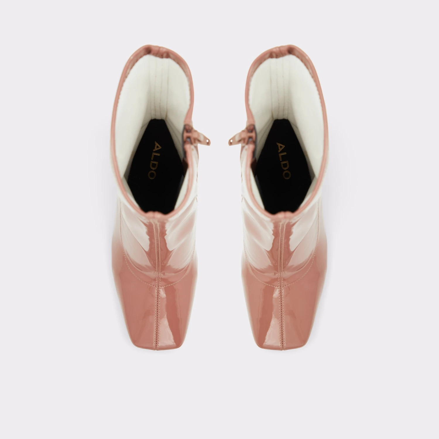 Dare to wear these outfit-making square toe ankle boots showcasing a glossy patent finish.